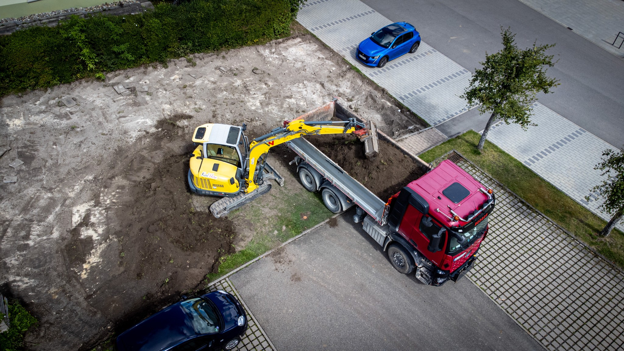 Aushub und Bodenabtrag für den Neubau eines Wohnhauses. Präzise Baugrubenerstellung mit moderner Baggertechnik und zuverlässigem LKW-Transport.